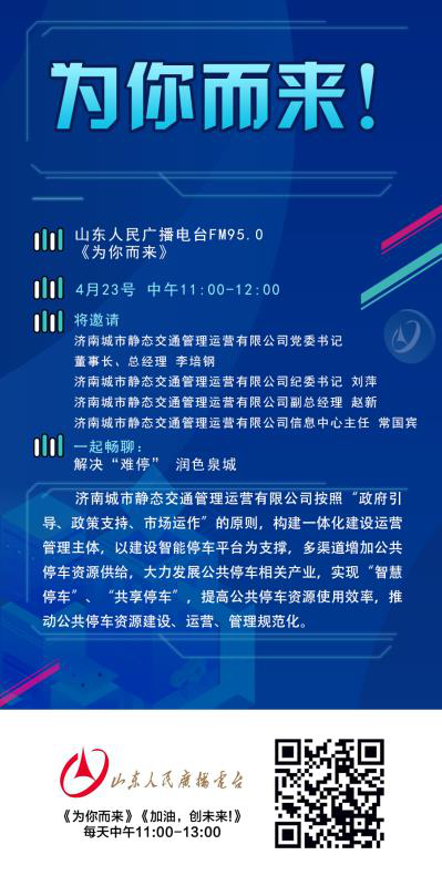 4月23日上午,公司黨委書記 、董事長,總經理李培鋼;監(jiān)事會主席、紀委書記劉萍;副總經理趙新;信息中心主任常國賓做客山東人民廣播電臺《為你而來》節(jié)目。就“舜耕智能停車場投入使用可以給大家停車帶來怎樣的便利?智能停車場有什么特點?停取車都有哪些步驟?都有哪些人性化服務、讓利于民的措施?收費標準是什么?”等大家關心的問題,在節(jié)目中作了詳細的解答。